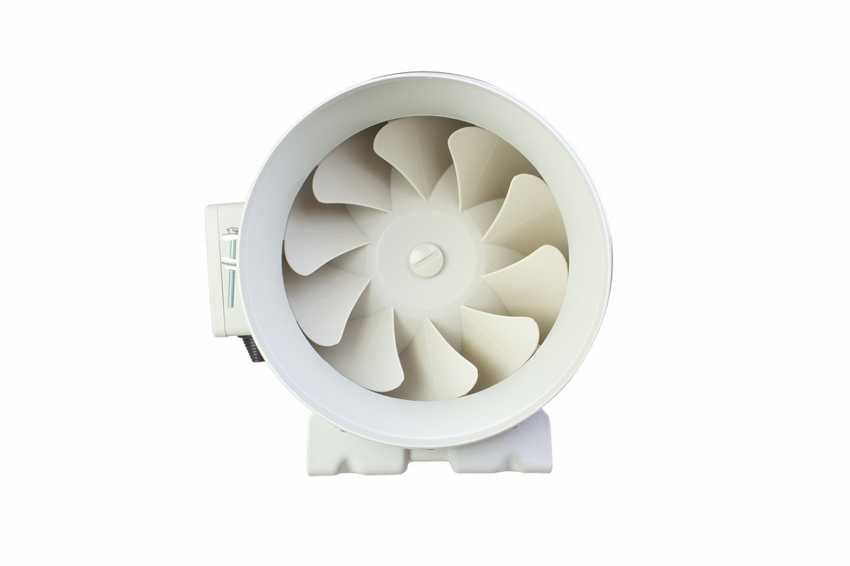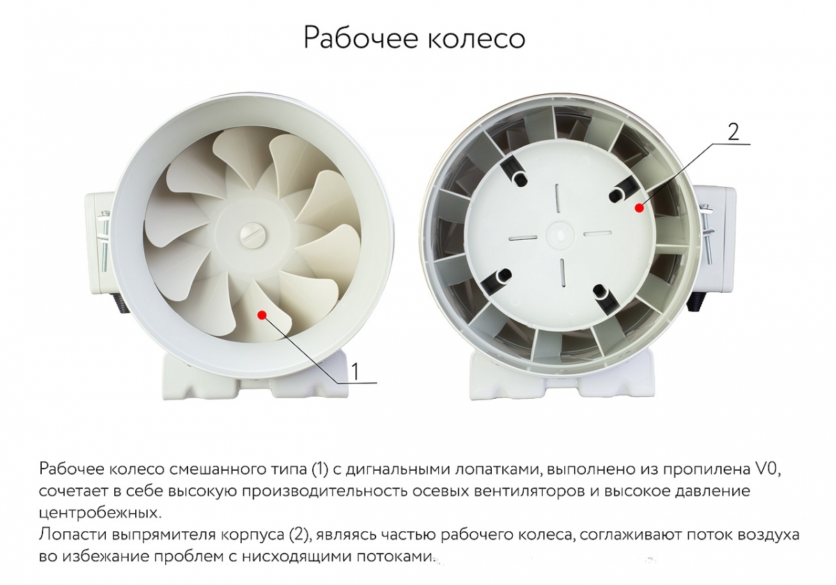 Низкий уровень шума. Лопасти выпрямителя корпуса являясь частью рабочего колеса, сглаживают поток воздуха во избежание проблем с нисходящим потоками.