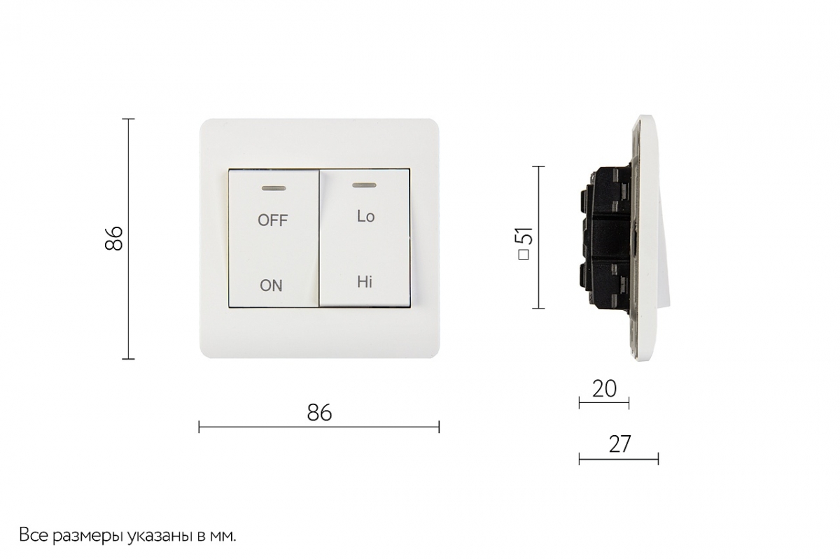 Электрическая схема подключения  Эксплуатация  Выключение/включение двигателя вентилятора происходит с помощью клавиш ON/OFF. Переключение скоростей вентилятора происходит с помощью клавиш Lo/Hi, где Lo – минимальная скорость, Hi – максимальная скорость вентилятора.