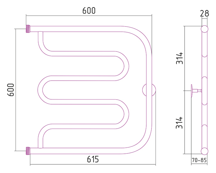 Полотенцесушитель водяной Стилье Тандем 600x600 резьба-сгон 1" + кронштейн